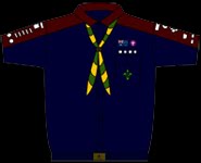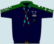 The Venturer Uniform consists of the dark blue shirt with the section colour, which is Maroon, across the sleeve, yoke and collar. The other components of the uniform are a blue or moss-green belt and a scarf and woggle.